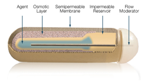 ALZET® Osmotic Pumps 是體積只有膠囊大小的滲透壓泵,符合 USP 醫(yī)療塑料膠材料生物相容性標(biāo)準(zhǔn),可植入實(shí)驗(yàn)動(dòng)物皮下或腹腔內(nèi),直接或通過導(dǎo)管以 ul/小時(shí)的速度緩慢持續(xù)準(zhǔn)確地送出測(cè)試藥劑。Alzet 緩釋泵由外到內(nèi)分為三層(如下圖所示),最外層是半透膜材料(Semipermeable Membrane),最內(nèi)層為不透水彈性材料制成的貯藥囊(Impermeable Reservoir),中間為高滲的鹽夾層(Osmotic Layer)。當(dāng)泵體被植入動(dòng)物體內(nèi)時(shí),由于滲透壓差迫使體液透過泵表面的半透膜流向高滲鹽夾層,擠壓貯藥囊,使藥物(Agent)按照預(yù)計(jì)速度經(jīng)導(dǎo)流管(Flow Moderator)釋放到動(dòng)物體內(nèi)。