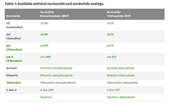 抗病毒核苷/核苷酸類(lèi)似物可以通過(guò)抑制病毒復(fù)制的幾個(gè)關(guān)鍵過(guò)程來(lái)抑制病毒繁殖,它們通過(guò)與天然的dNTP/NTP競(jìng)爭(zhēng)結(jié)合到新的病毒核酸中,從而導(dǎo)致鏈終止或者誘變。在細(xì)胞培養(yǎng)實(shí)驗(yàn)中,可以用抗病毒核苷酸的非磷酸化核苷變體,這種核苷酸在細(xì)胞內(nèi)被多種病毒和/或宿主激酶激活,從而發(fā)揮(tri)磷酸化形式的抗病毒作用。