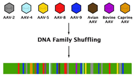 AAV共有12個(gè)血清型,其中AAV1-6是從人類組織中分離獲得,并且具有明確的的抗體反應(yīng)性,是目前常用的經(jīng)典AAV載體。盡管不同血清型AAV都具有正二十面體結(jié)構(gòu),但其衣殼蛋白在序列與空間構(gòu)象上的多樣性,使得AAV與不同細(xì)胞表面受體親和力及組織嗜性存在顯著差異。在感染嗜性方面,AAV-2的感染譜較廣應(yīng)用較多,AAV-1在骨骼肌中的轉(zhuǎn)導(dǎo)效率較高,AAV-3易于轉(zhuǎn)導(dǎo)巨核細(xì)胞,AAV-5和AAV-6感染呼吸道上皮細(xì)胞的優(yōu)勢(shì)較為顯著。因此,根據(jù)AAV不同血清型在組織感染性的相對(duì)特異性,可以用于在針對(duì)不同靶向組織的基因治療中尋求最佳的AAV載體類型與組合。除了常見(jiàn)的六個(gè)血清型AAV之外,Cell Biolabs還提供兩種重組型AAV包裝質(zhì)粒即AAV-DJ與AAV-DJ-8,如下圖所示,這兩種AAV的Rep-Cap基因是由多個(gè)野生型AAV的結(jié)構(gòu)基因重組而來(lái),與其他野生型相比,AAV-DJ在體外細(xì)胞轉(zhuǎn)導(dǎo)效率更高,AAV-DJ-8則更適用于體內(nèi)感染實(shí)驗(yàn)。