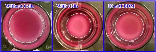 根據(jù)實(shí)驗(yàn)方案(上圖),虛線表示凝膠邊緣,用尺子分別測量無細(xì)胞組、有細(xì)胞組和10mM細(xì)胞收縮抑制劑BDM處理組的膠原基質(zhì)的直徑(單位:mm),對(duì)比BDM處理組與對(duì)照組細(xì)胞收縮的變化。