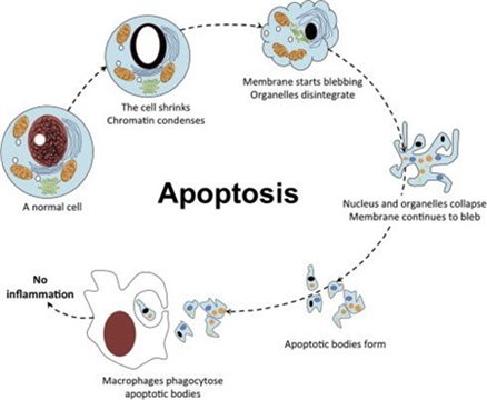凋亡的特征具有明顯的形態(tài)變化以及特定caspase和線粒體控制通路的激活。凋亡細胞出現(xiàn)細胞體積縮小,與周圍細胞脫離,然后細胞質(zhì)密度增加,通透性改變,染色質(zhì)濃縮和核碎裂,并顯示出稱為膜起泡的典型變形的膜,膜內(nèi)側(cè)磷酯酰絲氨酸外翻到膜表面,胞膜結(jié)構(gòu)仍然完整,無內(nèi)容物外溢,不引起周圍的炎癥反映。膜起泡可導(dǎo)致在垂死細胞邊緣形成小囊泡,稱為凋亡小體。凋亡小體可迅速被周圍的吞噬細胞吞噬。凋亡可以通過內(nèi)在或外在通路觸發(fā),內(nèi)在通路可以通過細胞應(yīng)激、DNA損傷、發(fā)育信號、存活因子缺失被激活,外在通路則是通過檢測到來自其他細胞的細胞外死亡信號來觸發(fā)的。