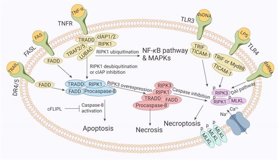 Fas又稱CD95,是由325個氨基酸組成的受體分子,它與其配體FASLG(CD178)結(jié)合可以啟動凋亡信號的轉(zhuǎn)導(dǎo)引起細胞凋亡。Fas具有特殊的死亡結(jié)構(gòu)域(DD,death domain),三聚化的Fas和FASLG結(jié)合后,使三個DD相聚成簇,吸引了胞漿中另一種帶有相同死亡結(jié)構(gòu)域的蛋白FADD。FADD是死亡信號轉(zhuǎn)錄中的一個連接蛋白,它由兩部分組成:C端(DD結(jié)構(gòu)域)和N端(DED)部分。C端與Fas的DD結(jié)構(gòu)域結(jié)合,N端連接另一個帶有DED的后續(xù)成分,由此引起N端DED隨即與無活性的caspase-8發(fā)生反應(yīng),進而引起caspases級聯(lián)反應(yīng),誘發(fā)細胞凋亡。Fas/FASLG涉及許多癌癥和免疫疾病的發(fā)病機制,如多發(fā)性硬化癥[2]。