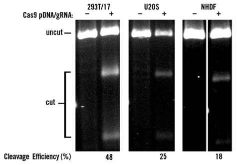 TransIT-X2®分別在293T/17、U2OS和NHDF細胞中共轉Cas9質粒DNA與gRNA實現了高效的基因編輯