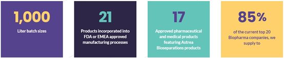 英國(guó)Astrea Bioseparations于1987年成立,公司前身是Affinity Chromoatography Ltd,其從英國(guó)劍橋大學(xué)獨(dú)立出來(lái)專(zhuān)注于吸附填料的研發(fā)和生產(chǎn)。Astrea Bioseparations 公司兩大核心專(zhuān)利技術(shù)(產(chǎn)品)Mimetic ligand® 和PuraBead® 是公司產(chǎn)品的基石,迄今為止已有21個(gè)上市產(chǎn)品(FDA/EMA) 使用 Astrea Bioseparations公司的產(chǎn)品用于商業(yè)化生產(chǎn),其中不乏跨國(guó)公司和新興生物技術(shù)公司。