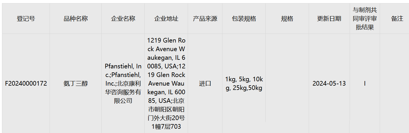 Pfanstiehl 喜獲第15個CDE登記號- 氨丁三醇Tris Base
