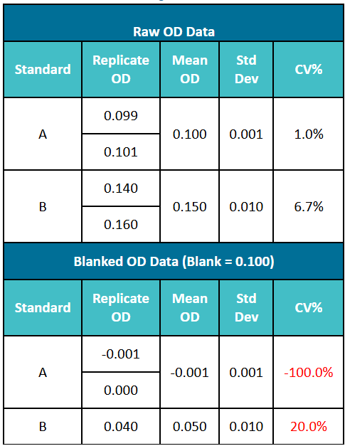 以下示例說明了背景值扣除對變異系數(shù)的影響。在表1中,標(biāo)準(zhǔn)A的平均OD值為0.100,標(biāo)準(zhǔn)B的平均OD值為0.150 。當(dāng)通過原始讀數(shù)減去空白對照的OD值來計(jì)算變異系數(shù)(CV)時(shí),CV值顯著上升,導(dǎo)致標(biāo)準(zhǔn)B的CV%從6.7%增加至20%。