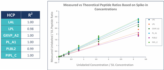 While the ELISA HCP detection method can assess overall HCP levels, it cannot identify specific types of lipases, making it difficult to precisely evaluate process-related risks. To address this issue, Cygnus Technologies has developed a targeted proteomics analysis method based on liquid chromatography-tandem mass spectrometry (LC-MS/MS) – the CHO 6xLipase? MS Assay. This method utilizes Parallel Reaction Monitoring (PRM) technology and Stable Isotope-Labeled peptides (SIL) to achieve absolute quantification of six CHO-derived HCP lipases known to cause Tween degradation::