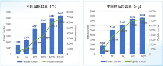 Approximately 6000 proteins can be stably detected from 100ng. The minimum initial sample amount can be as low as 1ng (equivalent to ~10 cells).